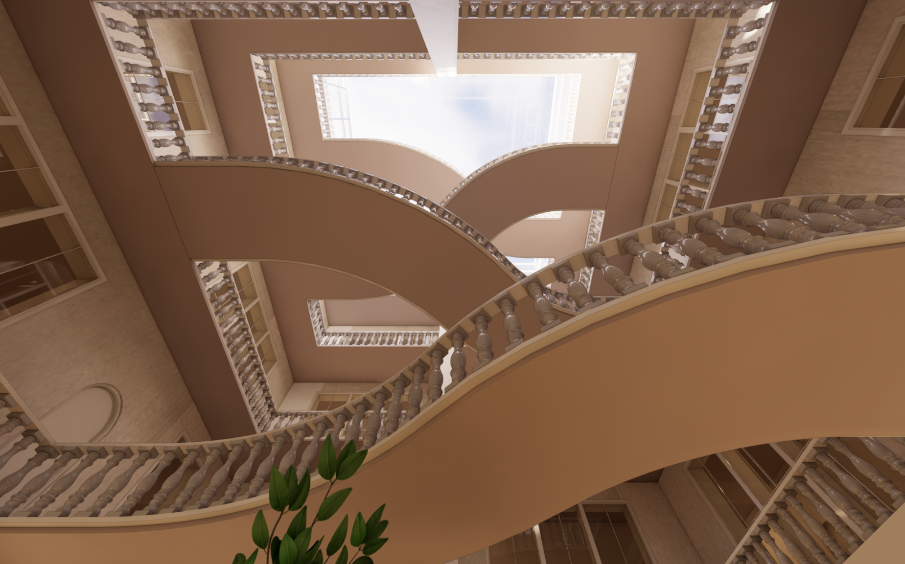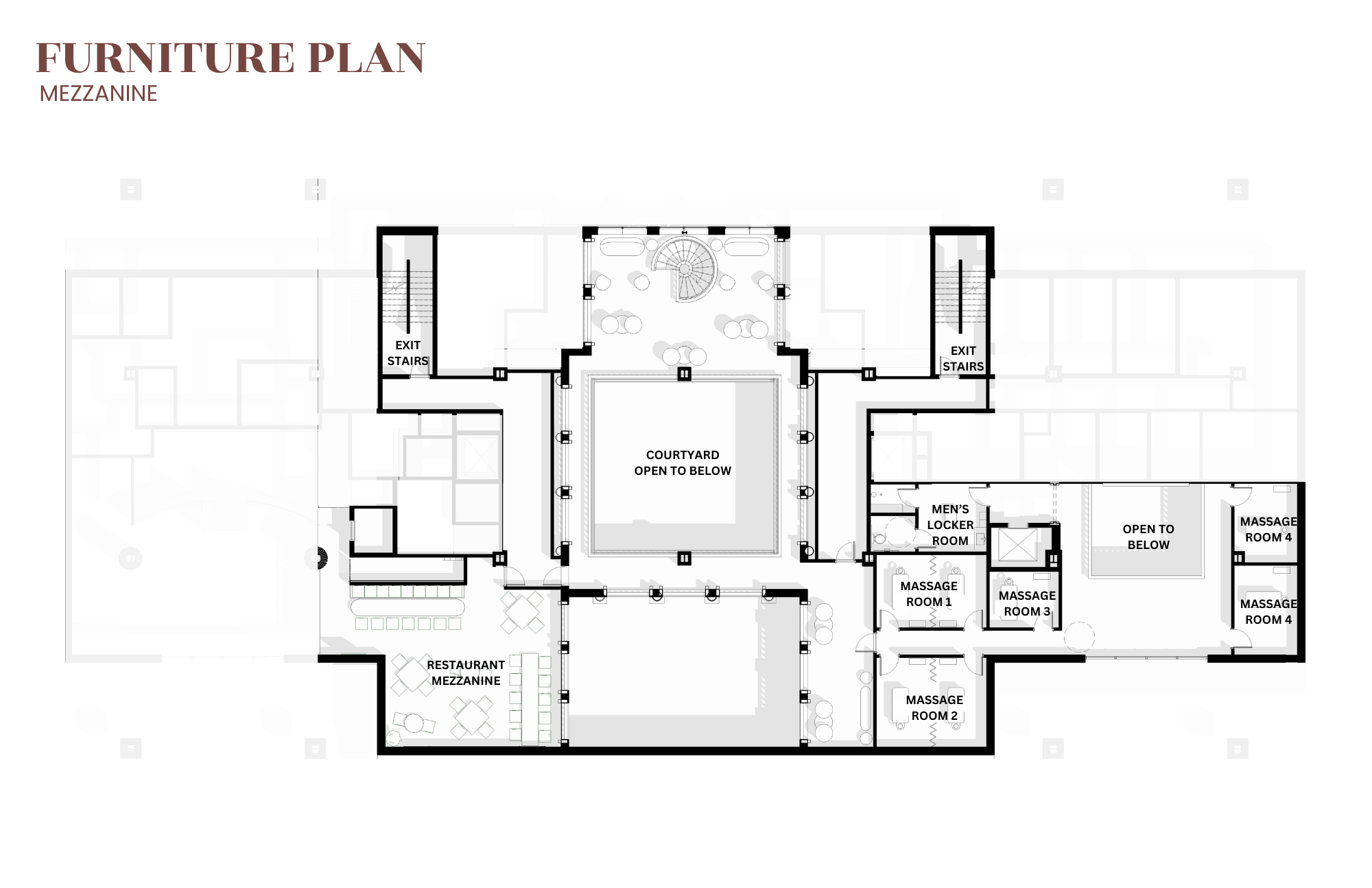 Many of these principles are most evident in the open courtyard, which extends vertically through the three-story atrium and anchors the overall spatial experience.