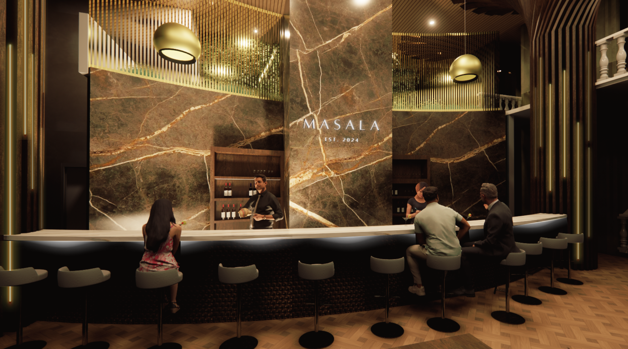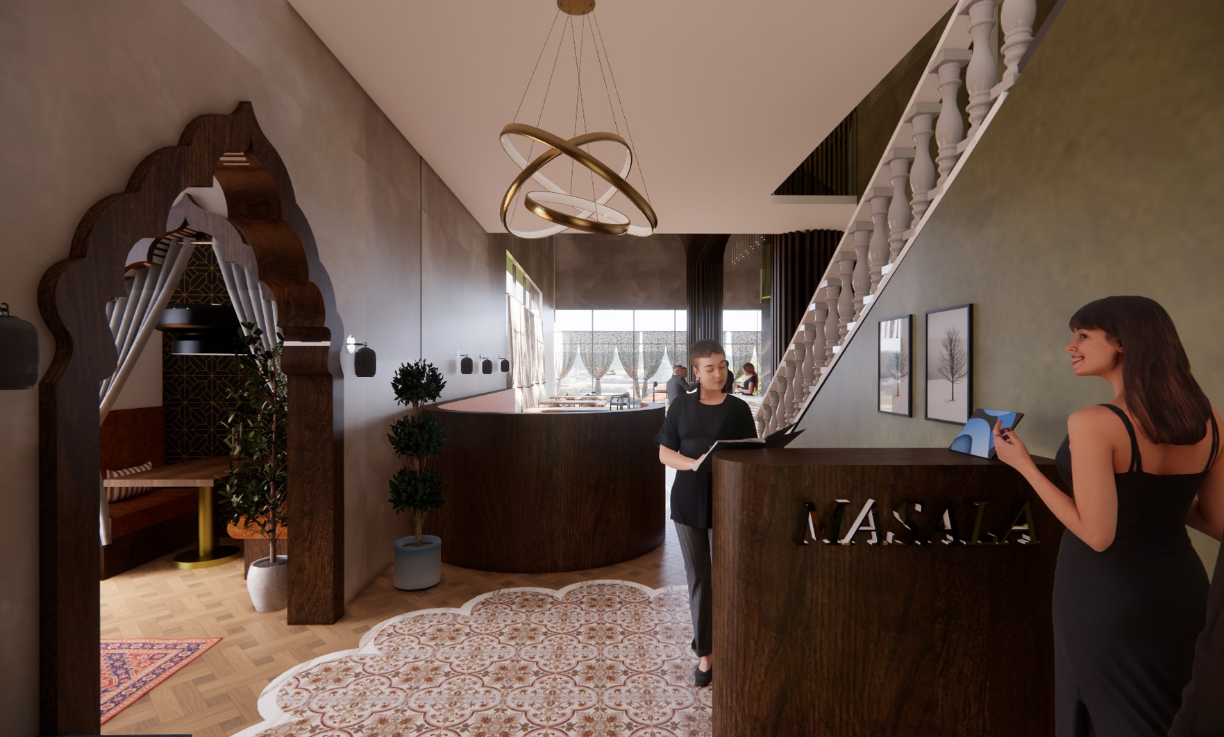 One of Hotel Rahana’s standout features is its restaurant, Masala, offering a main dining room, semi-private seating, and an expansive bar with adjustable LED lighting. The warm, earth-toned color palette creates an inviting atmosphere, while sculptural columns along the bar subtly mimic the form and rhythm of trees, reinforcing the biophilic concept. A cultural dining space on the mezzanine—accessible by stair and elevator—adds an elevated and immersive experience.