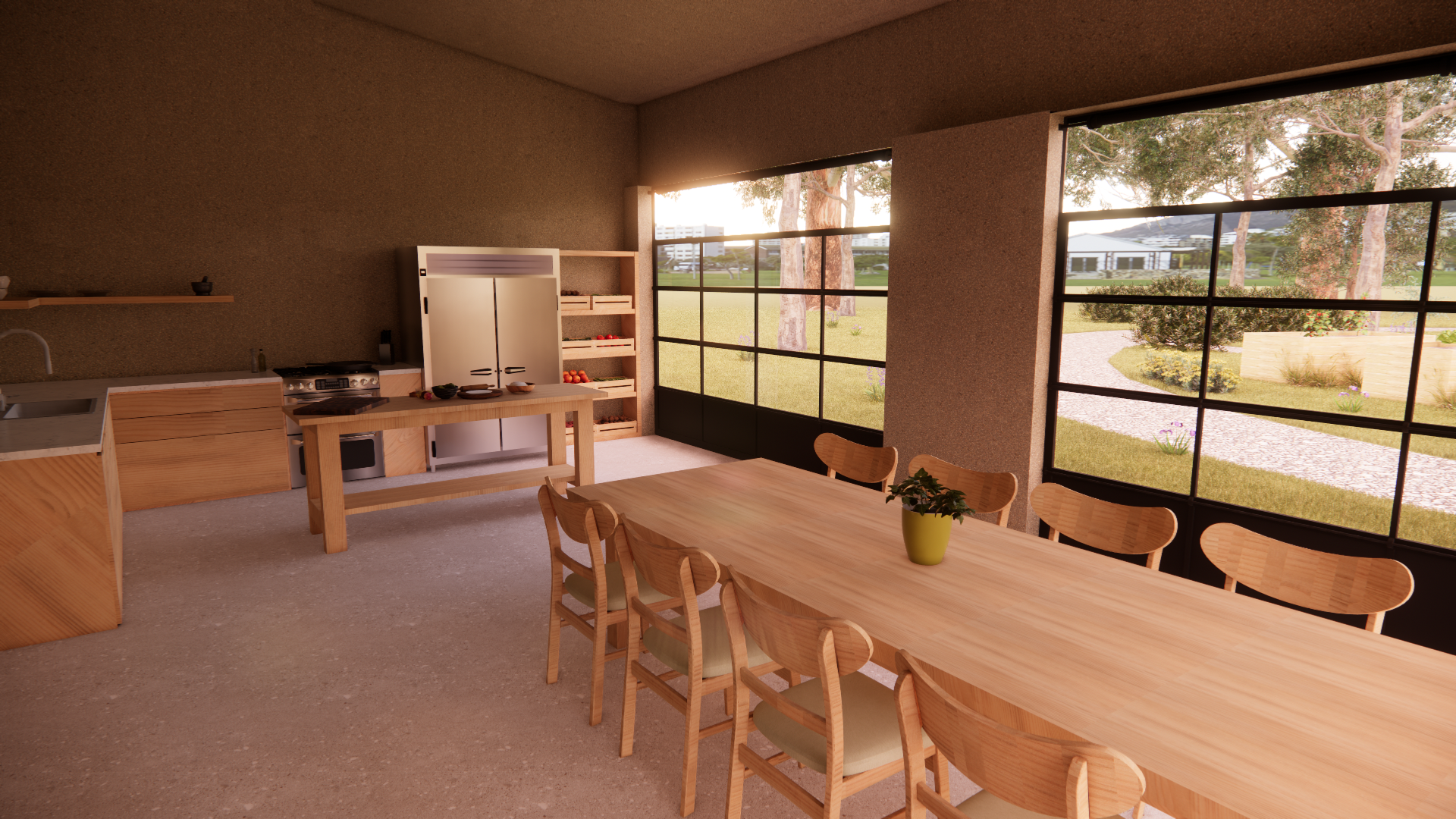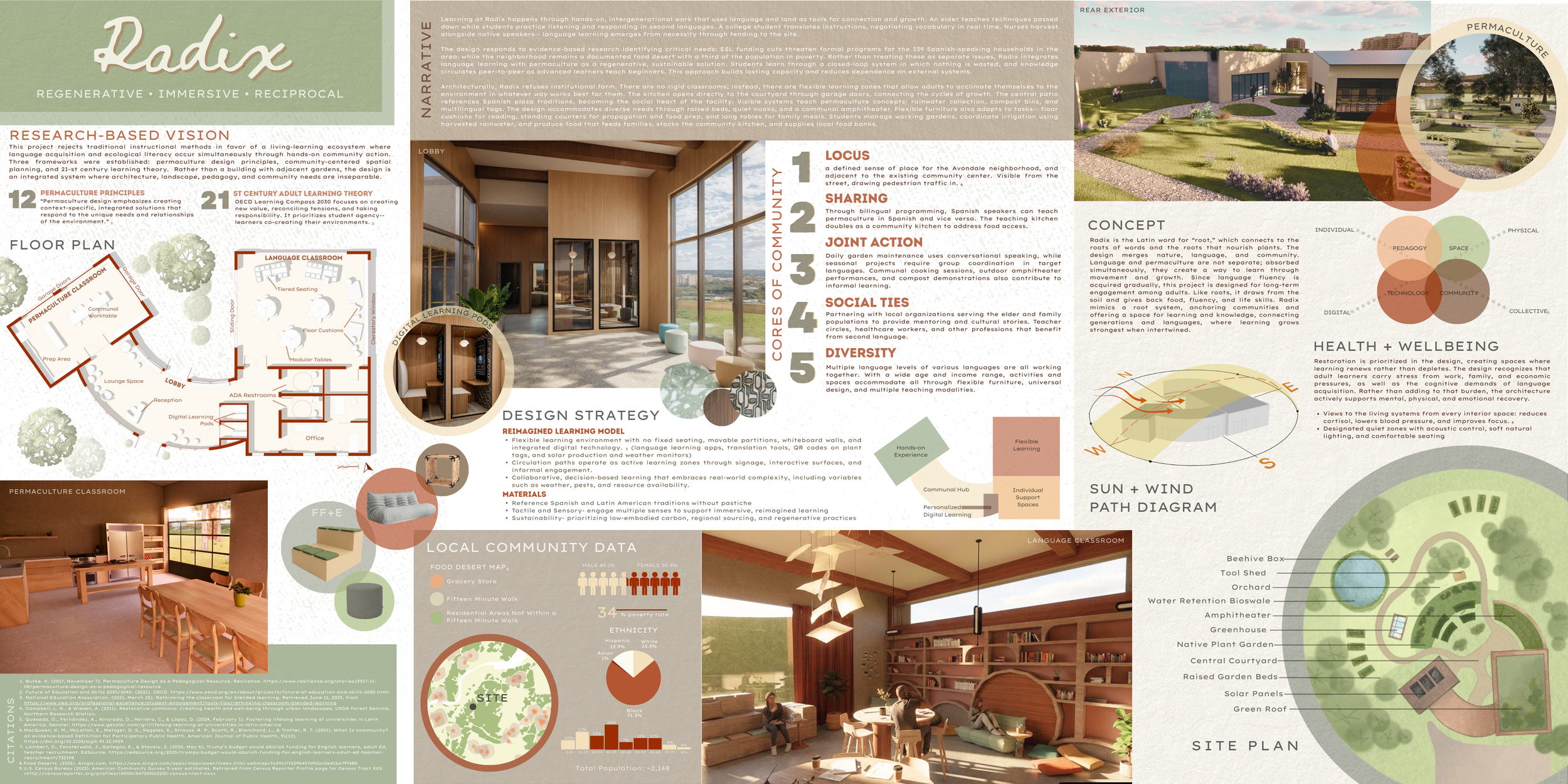 A language education center rooted in the principles and practice of permaculture. Radix rethinks adult language education as something lived rather than lectured. Set within a food desert in a low-income neighborhood with a strong Spanish-speaking community, the project responds to limited ESL access and food insecurity by transforming the idea of the classroom into flexible, community-centered spaces organized around a courtyard inspired by Spanish plazas. Grounded in adult learning theory and permaculture principles, language is learned through gardening, shared meals, and public gatherings, where everyday interaction becomes the curriculum. Sustainable systems like rainwater collection and food production are intentionally visible, turning the building itself into a teaching tool. Through inclusive design strategies and adaptable, restorative interiors, Radix shows how interior architecture can nurture growth, connection, and long-term community resilience.